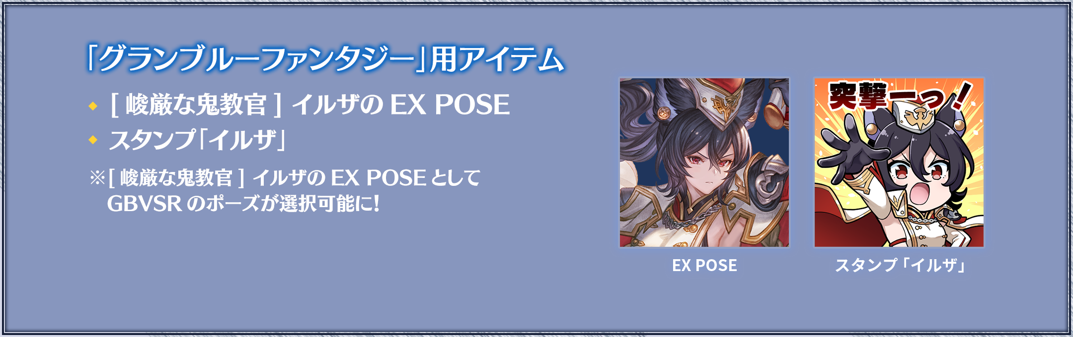 「[峻厳な鬼教官]イルザのEX POSE」は「グランブルーファンタジー」内で対象のキャラクターを所持している場合のみスキン・POSE切り替え設定から設定できます