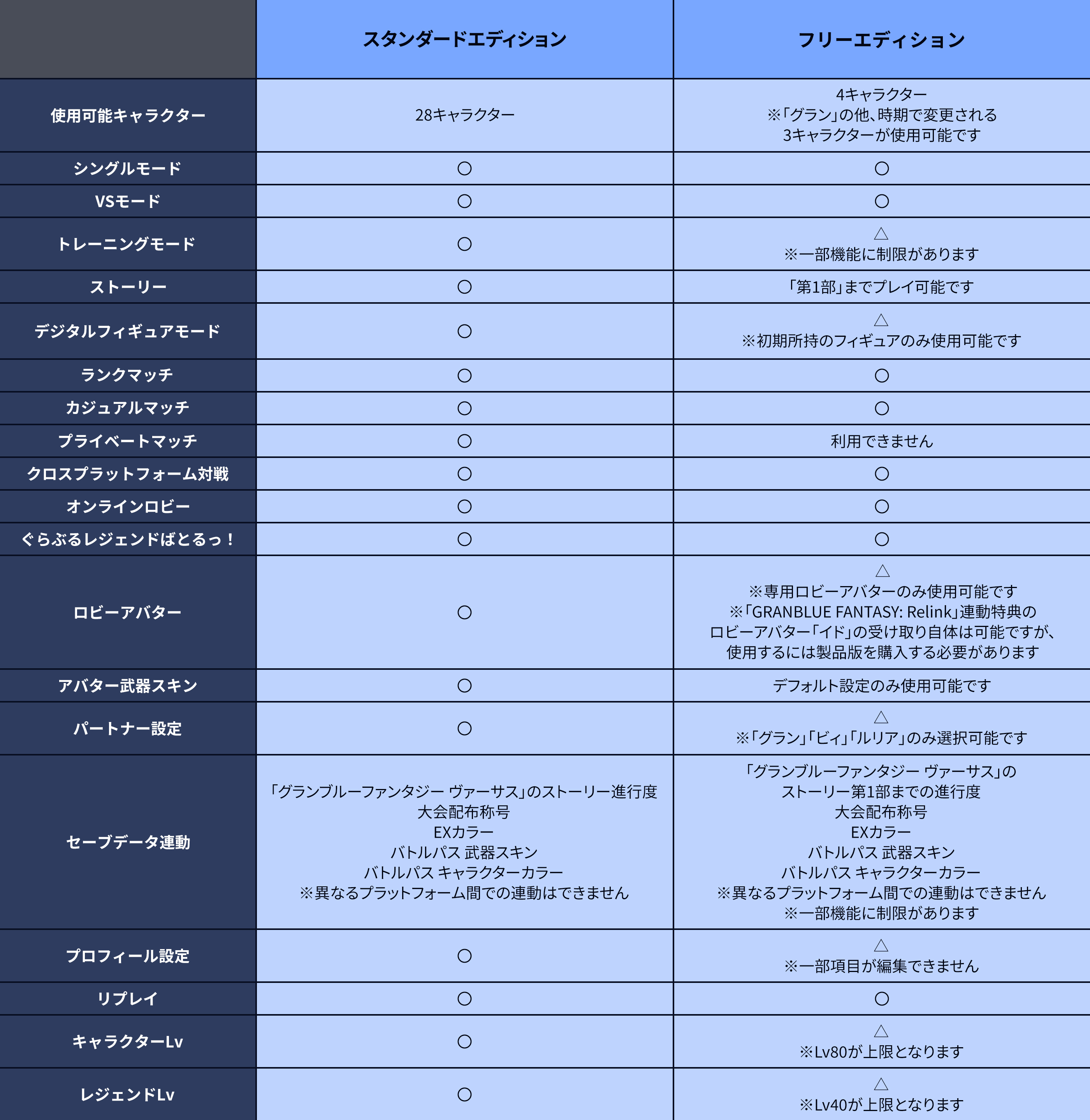 - 「Granblue Fantasy Versus: Rising」ゲーム本編各エディションのプレイヤーとオンライン対戦がお楽しみいただける他、各エディション購入時にはフリーエディションのセーブデータを引き継ぐことが可能です一部機能に制限があります